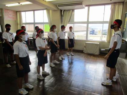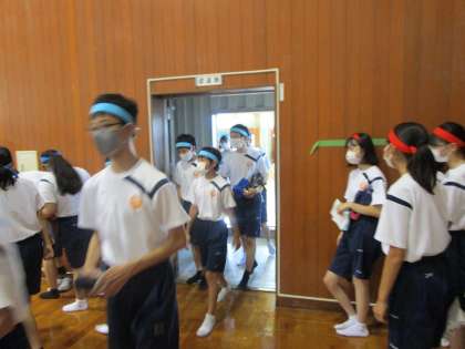 体育大会に向けて・その3 公開日 2021/09/22 更新日 2021/09/22 今日の興南中 9月22日(水) 1限 校舎内をローテーションで団活動を行いました。 (写真 左:3階1年生教室で活動する赤鳳団) (写真 右:武道館での活動を終えた青龍団が次の活動場所へ移動中)