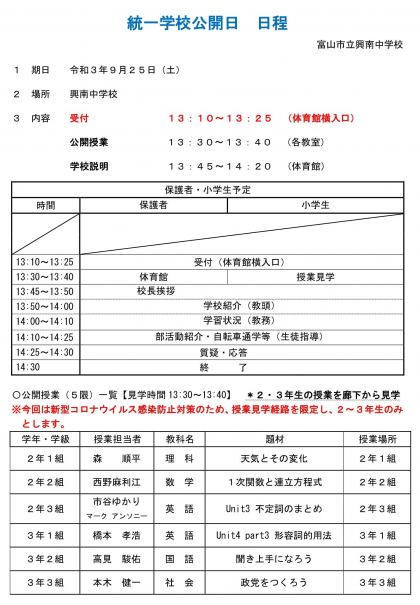 この日程は、「統一学校公開日」日程 をクリックしてご覧ください。