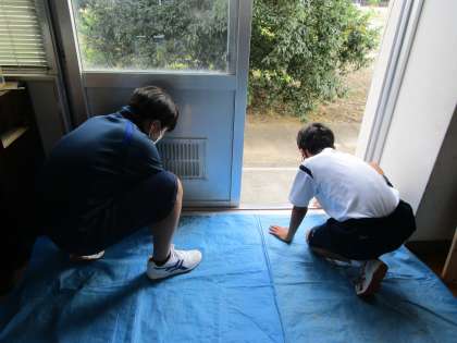 体育大会で、トイレを利用する際、外履きのまま校舎内に出入りできるように、美化実践部は技術室にブルーシートを設置しました。