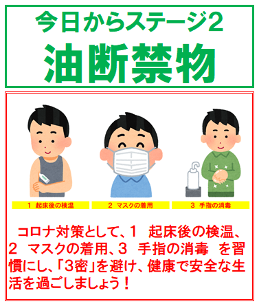 1 起床後の検温、2 マスクの着用、3 手指の消毒 を習慣にし、「3密」を避け、健康で安全な生活を過ごしましょう!
