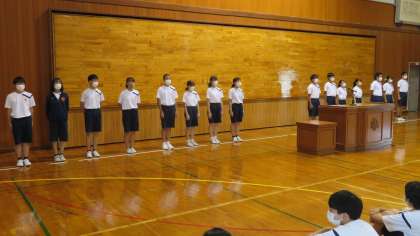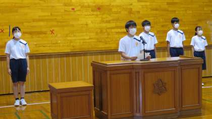 体育大会・全体練習の前に、体育館で「生徒会役員任命・認証式」を行いました。