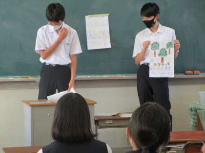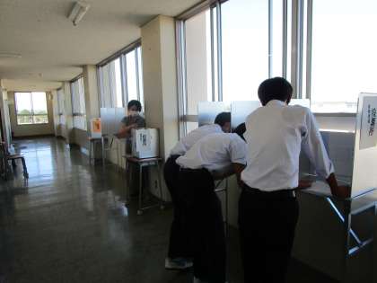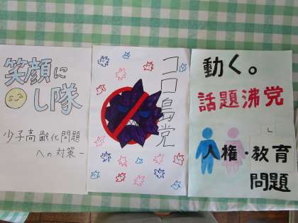 3年・社会・選挙をしよう! 公開日 2021/09/30 更新日 2021/09/30 3年生 9月30日(木) 2・4限 3年の社会は、日本の選挙制度について学習しています。 今回は自分たちで結成した政党の党首や候補者が演説を行い、生徒が有権者として投票しました。 「コロナにか党」「高齢者を支え隊」等、生徒が現在の日本のもつ課題解決を目指す政党が結成されました。 (写真 上:3年3組 中:3年2組の政党ポスター) (写真 下:記載台と投票箱を使用して投票)