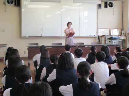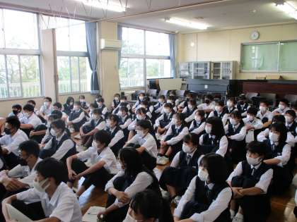 合唱コンクールリーダー研修会を行い、各学級の指揮者、伴奏者、パートリーダー、実行委員計8名、合計72名が集まりました。