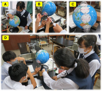 緯度の違う北極付近、日本、赤道、シドニー(南半球)、南極付近の5つの地点の太陽の動きを調べました。(写真:A〜D)