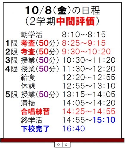 明日は、「2学期・中間評価・2日目」です。