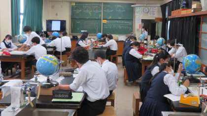 3年・理科・太陽の動き 公開日 2021/10/08 更新日 2021/10/08 3年生 10月8日(金) 5限 3年1組の理科は、「緯度の違いによって太陽の動きが異なる理由を明らかにしよう」を学習課題に、ミニ透明半球を使って実験しました。 日本と緯度の違う4つの地点の太陽の動きを調べました。 緯度が違うことで、太陽の動きがどのように変わるのか、つかめることができたでしょうか!