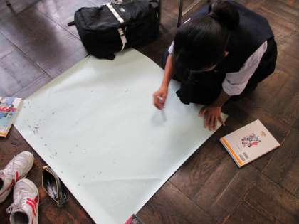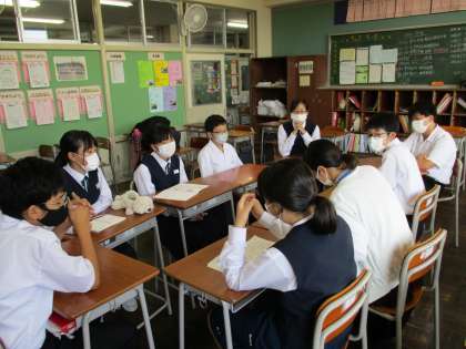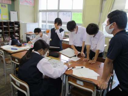 1年生は、今週の放課後、みんなの士気を高めるために、校外学習実行委員や合唱コンクールリーダーが集まって、スローガンを決めたり、ガンピに歌詞やクラス目標を書いたりしました。