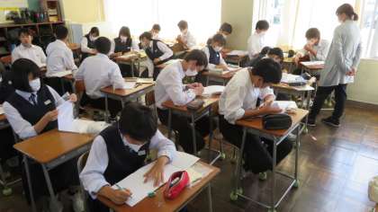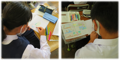 3年2組の家庭科は、「幼児が喜ぶ絵本をつくろう」という学習課題の下、絵本づくりに着手しています。