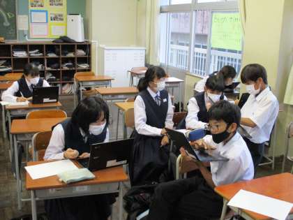 高岡の見どころ掲示チームは、各クラスの掲示係が集まって、クロムブックで高岡の見どころを調べて下書きを作りました。