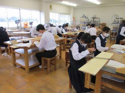 (写真 下:1年3組 家庭科の授業)