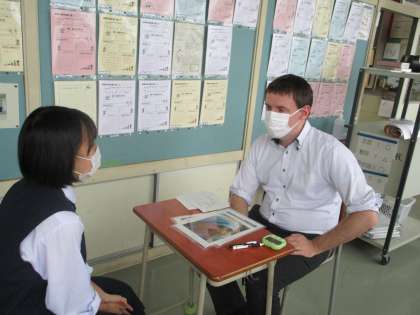 3年生の英語は、ALTマーク先生がスピーチテストをしています。