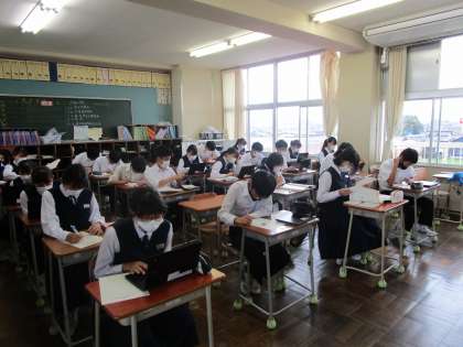 待機中の生徒は、クロムブックを使って文法の問題を解いています。
