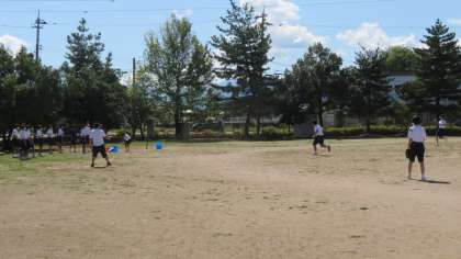 2年2組の体育は、グラウンドでソフトボールです。(写真:上、下)