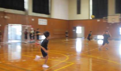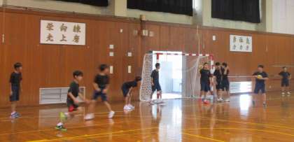 体育館ではハンドボール部がパスからのシュート練習を行っています。