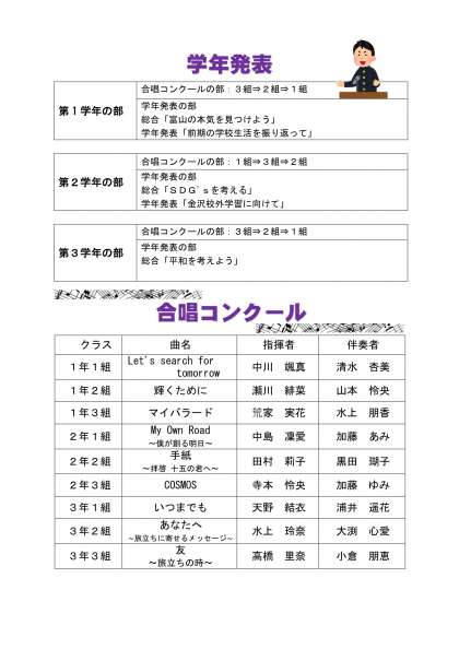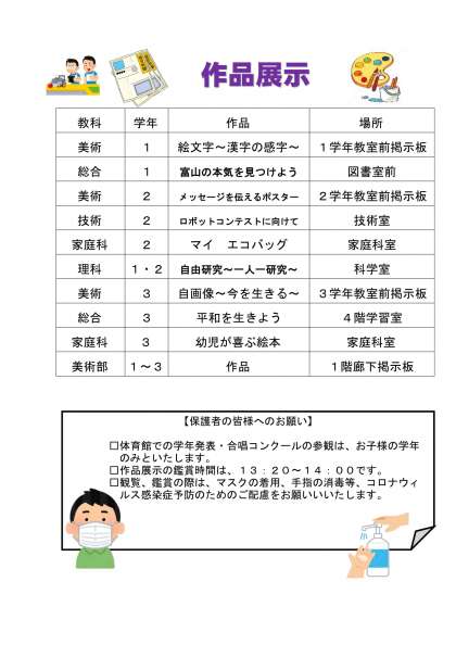 保護者の皆様には、ぜひ学校に足を運んでいただき、子供たちの学年発表の参観、作品展示の鑑賞をお願いしたいと思います。