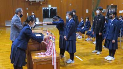「興南のつどい」特集・その23 公開日 2021/10/23 更新日 2021/10/23 今日の興南中 10月23日(土) 13:20 表彰式・閉会式 堀岡先生から講評があり、野田合唱コンクール実行委員長から審査結果が発表されました。 最優秀賞 ……3年3組 2年・優秀賞…2年3組 1年・優秀賞…1年2組 ▼最優秀賞を受賞した3年3組