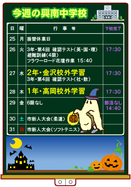 1年…10/28、高岡校外学習(弁当必要です)