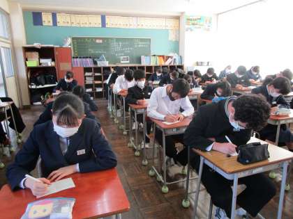 3年・授業風景 公開日 2021/10/26 更新日 2021/10/26 3年生 10月26日(火) 5限 「興南のつどい」を終え、気持ちを切り替え、授業に集中して取り組んでいます。 (写真 上:3年1組 数学 相似の証明のテスト) (写真 中:3年2組 体育 ソフトボールのゲーム) (写真 下:3年3組 理科 力学の学習)