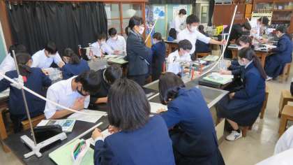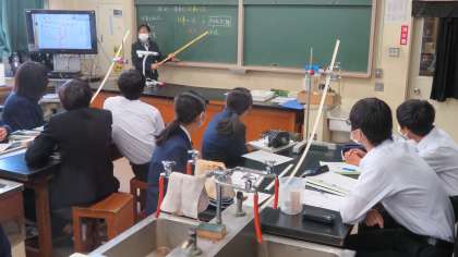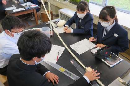 3年1組の理科は、科学室で、「仕事と力学的エネルギーはどのような関係があるか」を調べる実験を行いました。