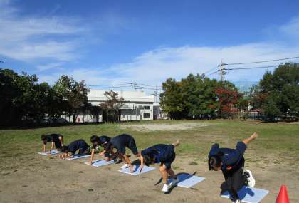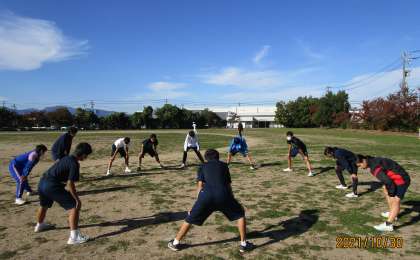 さわやかな秋晴れのもと、グラウンドでは陸上競技部が練習しています。