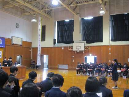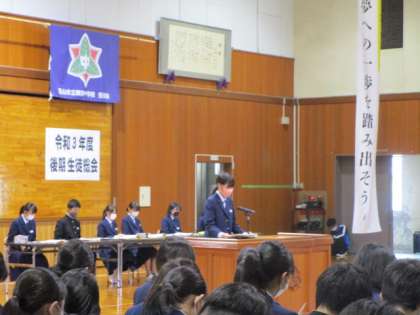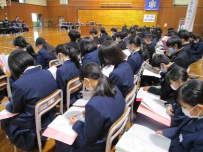 後期生徒総会 公開日 2021/11/02 更新日 2021/11/02 今日の興南中 11月2日(火) 5限 「令和3年度 後期生徒総会」を体育館で行いました。 生徒会執行部や各実践部からの活動計画案が提示され、生徒は質疑応答にも意欲的に参加しています。 一人一人が自分の考えをもち、真剣な態度が伝わります。 (写真 上:実践部長の説明) (写真 中:1年生も集中しています) (写真 下:質疑応答のようす)