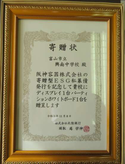 寄贈式 公開日 2021/11/08 更新日 2021/11/08 今日の興南中 11月8日(月) 14:00 阪神容器株式会社の寄贈型ESG私募債発行に基づき、株式会社北陸銀行から、55型大型ディスプレイ1台とパーティションホワイトボード1台を寄贈していただきました。 大切に使いたいと思います。 ありがとうございました! (写真:下 左から) 北陸銀行富山駅前支店長、校長、阪神容器代表取締役社長