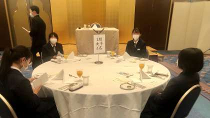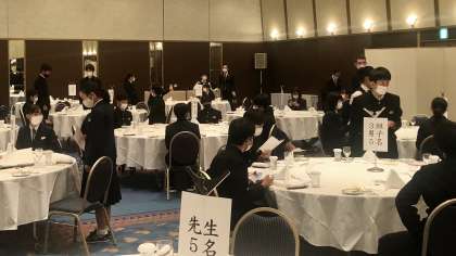 3年・校外学習・その8 公開日 2021/11/09 更新日 2021/11/09 今日の興南中 11月9日(火) 12:20 相倉集落のあと、ヨッテカーレ城端に寄って、ホテルニューオオタニ高岡に到着しました。 テーブルマナーが始まります。