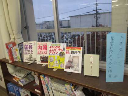各学年、期末評価の範囲表が配られたので、図書実践部は臨時に集まって、テストに役立つ本コーナーを図書室に設置しました。