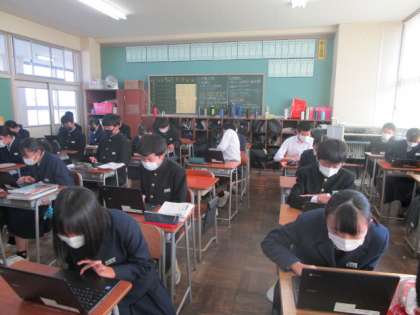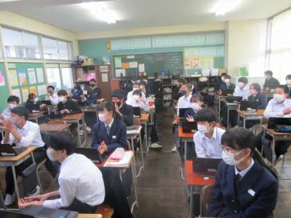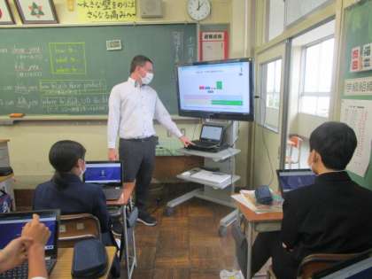 2年・英語・マーク先生と… 公開日 2021/11/15 更新日 2021/11/15 2年生 11月15日(月) 3,4限 2年の英語は、マーク先生とクロムブックを使ったクイズをしました。 文法問題を解くと、正解者のランキングが発表されます! 生徒は真剣に取り組みます。 上位者の発表に拍手も起こりました。 (写真 中:2年3組 下:2年1組)