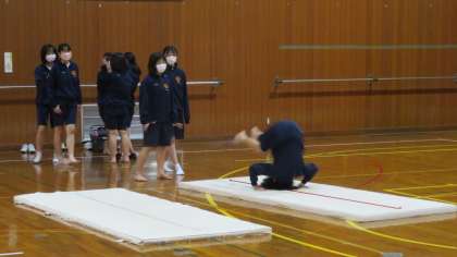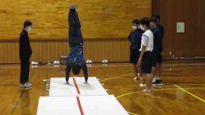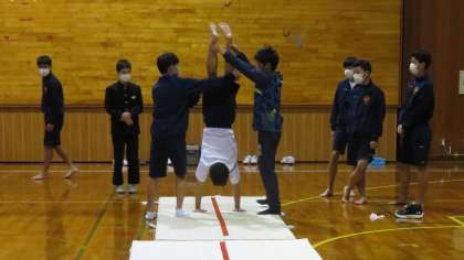 2年・体育・マット運動 公開日 2021/11/22 更新日 2021/11/22 2年生 11月22日(月) 4限 2年2組の体育は、体育館で、マット運動をしていました。 今日は、開脚後転、開脚前転を中心に練習していました。 そのあとは、倒立前転にも挑戦し始めました! (写真 中:宮森先生の倒立前転 すごいです!) (写真 下:補助を付けて、倒立前転にも挑戦しています。)