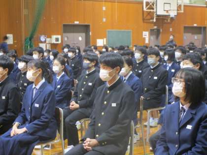 全校生徒が体育館に集まり、中林冴理(なかばやし さえり)先生の「着任式」を行いました。