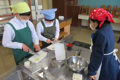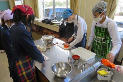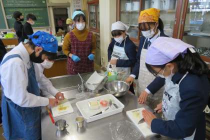 1年・家庭科・調理実習・その2 公開日 2021/12/02 更新日 2021/12/02 1年生 12月2日(木) 5,6限 前回の包丁の使い方を応用して、にんじんをいちょう切りにしたり、しょうがをみじん切りにしたりしていましたが、珍プレー・好プレーが随所に見られました。