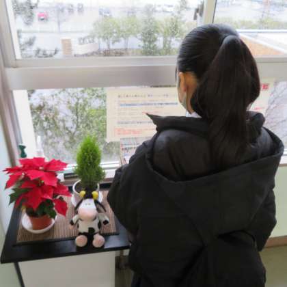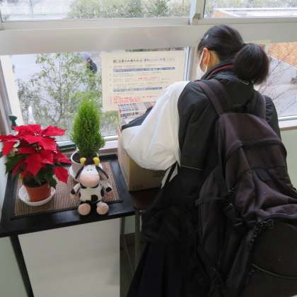 今朝も職員室前にテキストを取りに来ました。(写真)