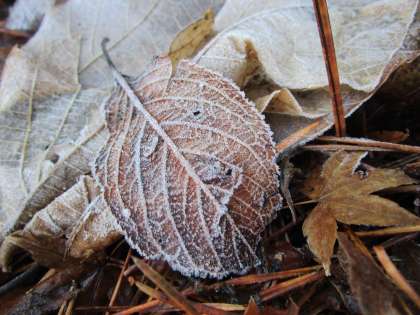 寒〜い朝・その2 公開日 2021/12/14 更新日 2021/12/14 今日の興南中 12月14日(火) 8:00 今朝は放射冷却現象のため、気温が低いです。 特に地表付近の気温が低いため、霜が降りています。 落ち葉の葉脈が霜できれいに縁取られています。