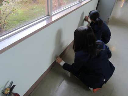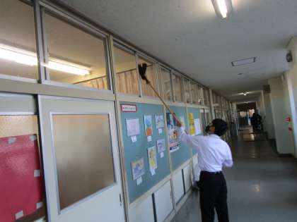 本日の重点箇所は廊下や教室の壁の汚れ落としと廊下のすす払いです。