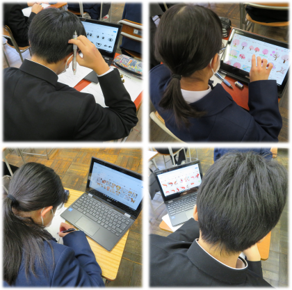 1年・校内互見授業・美術 公開日 2021/12/17 更新日 2021/12/17 1年生 12月17日(金) 1限 1年3組では、美術の互見授業を行いました。 学習課題は、「自分が選んだことわざや慣用句を絵文字を使って表現してみよう」です。 生徒は、クロムブックを使って、自分のアイデアと融合させて、イラストを描いています。(中の写真4枚) どんな作品ができるかワクワクします!