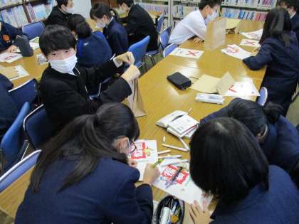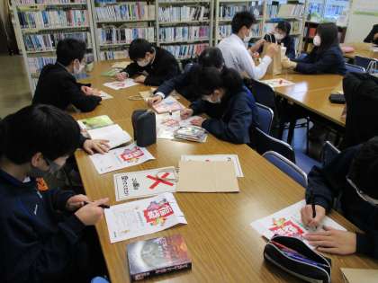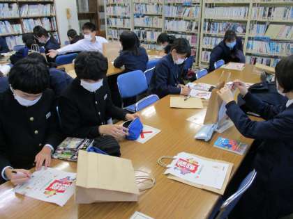 図書実践部・福袋づくり 公開日 2021/12/17 更新日 2021/12/17 今日の興南中 12月17日(金) 放課後 図書実践部は、臨時に集まって、1月の本の福袋をつくりました。 袋にはおすすめのポイントが書いてあります。 冬休みに読む本を借りに、図書室にも足を伸ばしてください。