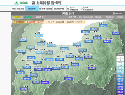 ここをクリックすると、県内各地の降雪予測量や現在の積雪量が表示されています。