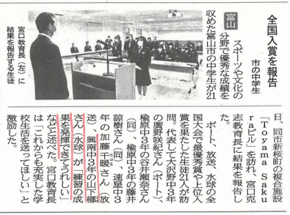 新聞に注目! 公開日 2021/12/22 更新日 2021/12/22 今日の興南中 12月22日(水) 9:30 今日の朝刊に、昨日行われた「市教育委員会小・中学校表彰式」のようすが出ていました。 本校からは、女子水球競技の4名が表彰されました。 ▼12/22 北日本新聞(23面)
