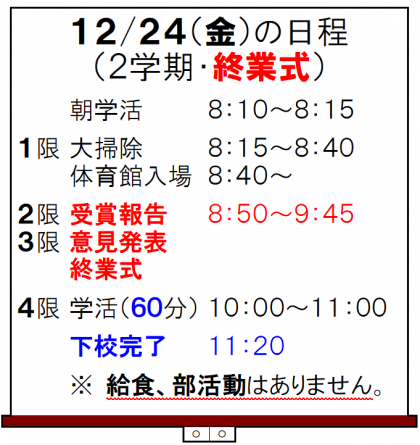 明日24日(金)は、「2学期・終業式」です! 公開日 2021/12/23 更新日 2021/12/23 今日の興南中 12月23日(木) 16:00 明日は「2学期・終業式」です。(日程は、下記のとおりです。)