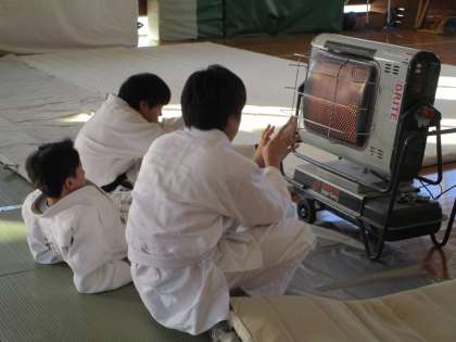柔道部は、準備運動前に体を暖めて筋肉をほぐしています。