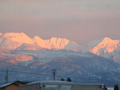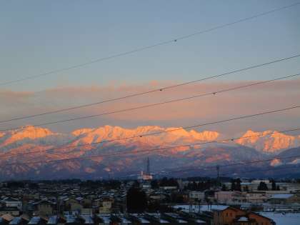 校舎東側の立山連峰が夕陽に染まっています。