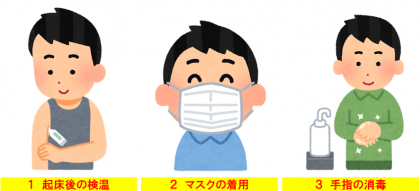 今までと同様、「1 起床後の検温」「2 マスクの着用」「3 手指の消毒」の感染防止対策をお願いします。