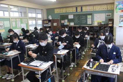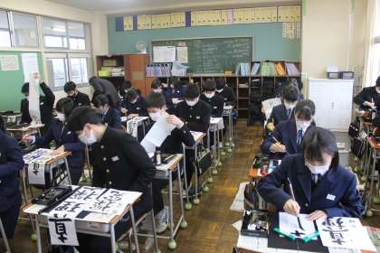 3年・校内書初大会 公開日 2022/01/11 更新日 2022/01/11 3年生 1月11日(火) 9:30 3年生は、行書で「真理探究」と書きました。 真剣な表情で一文字一文字丁寧に書いています。 (写真 上:3年1組 中:3年2組 下:3年3組)