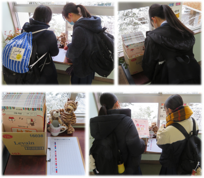 3年・「理科コツコツ学習」再開! 公開日 2022/01/12 更新日 2022/01/12 3年生 1月12日(水) 7:50 今朝から「理科コツコツ学習」が再開いました。 早速、職員室前にテキストを取りに来ました。(写真) トラ之助もヒョウ介も見守っています。(写真:左下) (降雪のため遅れがちになっていたのは残念です。)