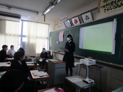 2年・英語・プレゼンテーション 公開日 2022/01/19 更新日 2022/01/19 2年生 1月19日(水) 2限 2年2組の英語は、英語でプレゼンテーション(発表)を行いました。 友達にインタビューし、調査した結果を発表します。 緊張しながらも「伝える」ことを意識してスピーチができました。