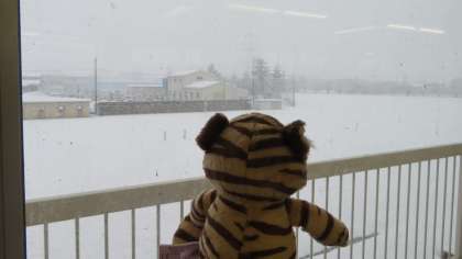 気温は1度、すごい雪が降っています。