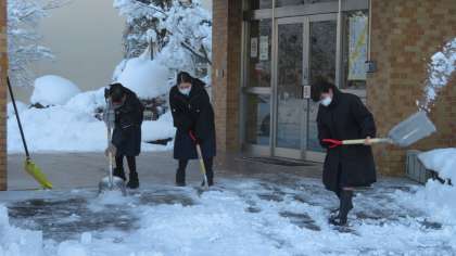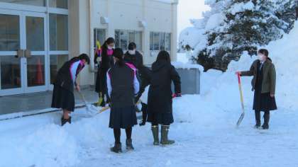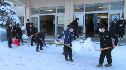 朝のひとこま・その2 公開日 2022/02/07 更新日 2022/02/07 今日の興南中 2月7日(月) 7:50 敷地内は除雪機でほぼきれいになっていますが、…… 除雪当番の1年2組が出動しました! 除雪機ではできない正面玄関のスロープ(写真:上)や生徒玄関前の段差(写真:中、下)をきれいに除雪してくれました。 1年2組のみなさん、どうもありがとう!