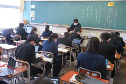 2年・授業風景 公開日 2022/02/10 更新日 2022/02/10 2年生 2月10日(木) 3限 明日は「建国記念の日」のため休みなので、今日が今週最後になります。 「逃げる月」というだけあって、2月は月日が経つのが早いです。 (写真 上:2年1組 家庭科の授業) (写真 中:2年2組 社会の授業) (写真 下:2年3組 国語の授業…クロムブックを活用して)