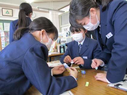 図書実践部・「本の福袋 当選者しおり作り」 公開日 2022/02/14 更新日 2022/02/14 今日の興南中 2月14日(月) 今日は「本の福袋 当選者しおり作り」の予備日でした。 当たった生徒は「お母さんにプレゼント」「友達にプレゼント」と言いながら、思い思いのしおりを作っていました。 喜んでくれるといいですね。